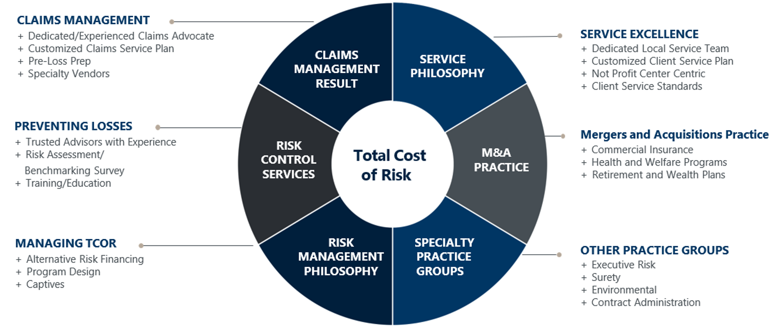 Here are some of the methods we use in a cohesive plan to address your Total Cost of Risk: