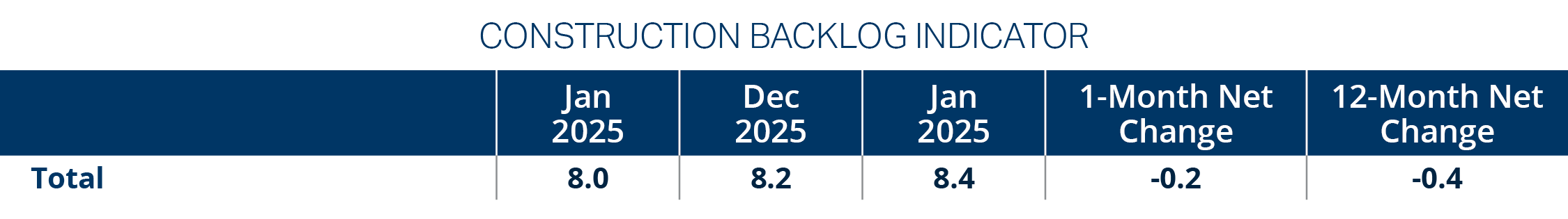 Construction backlog remains stable at approximately eight months, signaling continued work under contract despite uneven market momentum. However, backlog strength is increasingly concentrated among large contractors, driven primarily by data center activity.7