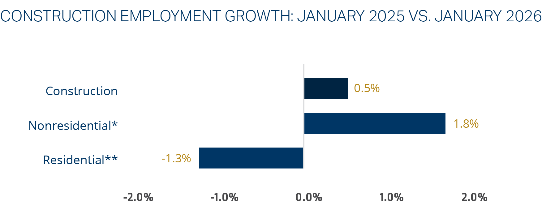The construction sector conditions reflect adjustment rather than acceleration. Residential construction remains constrained by elevated inventory and subdued single-family demand, while nonresidential activity has flattened due to uneven performance across segments. Infrastructure, power, and publicly funded projects continue to provide stability, but overall growth is increasingly concentrated in fewer, higher-value projects.