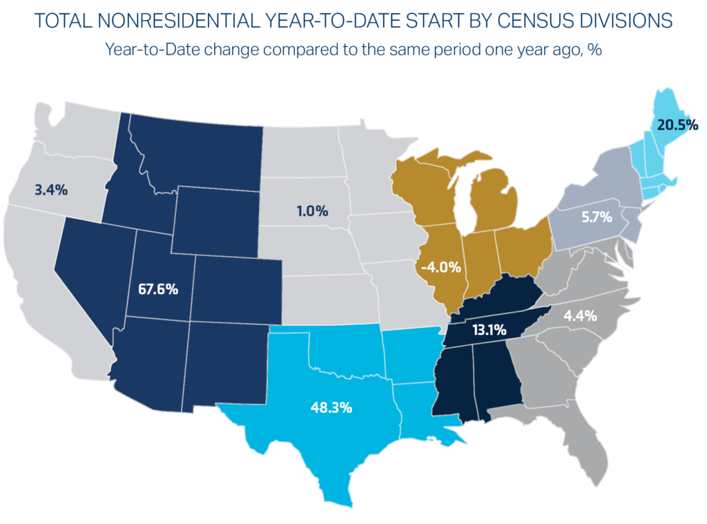 Year-to-date, the Mountain region has significantly outpaced other regions, driven largely by mega projects in Arizona. Arizona recorded a substantial year-over-year increase in starts, reflecting a combination of data center development, infrastructure expansion, and available undeveloped land. Starts in the West South Central region, heavily influenced by Texas, lagged relative to the Mountain region’s growth.
