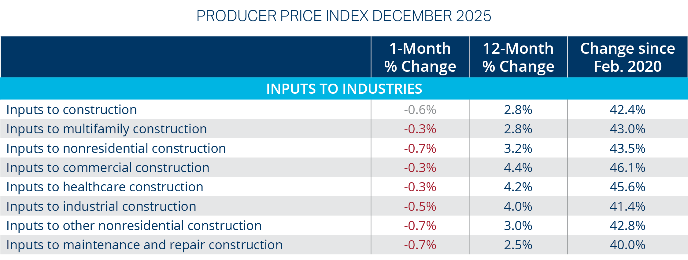 Inputs to construction increased 2.8% year-over-year in December 2025, with nonresidential and industrial inputs showing the strongest gains. Copper wire and cable experienced the largest twelve-month price increase (22.3%), aligning with reported electrical supply constraints.