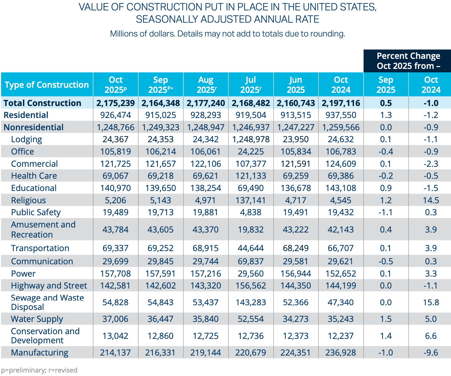 Source: Data compiled from the US Census Bureau. Value of Construction Put in Place in the United States, Seasonally Adjusted Annual Rate. Data as of October 2025. Release date January 21, 2026.1